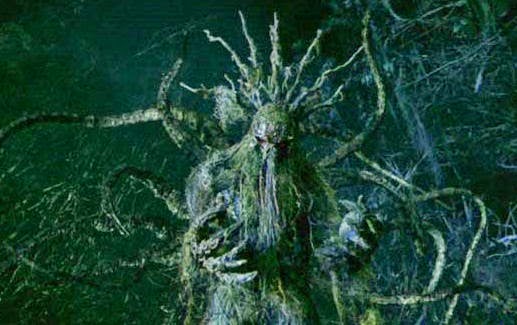 In the movie, the Man-Thing is some combination of a plant elemental and an avenging ghost. He strikes out seemingly at random, ripping humans apart or making plants grow inside their bodies, bursting out with bloody results. He was originally a Native American buried beneath an oil drill, and he is only defeated when that drill is destroyed.