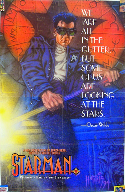 Starman is a character that dates back to the Golden Age of Comics. For those who didn’t bother with the link, the Golden Age was a time from about 1938 to 1950 when superhero comic books were churned out like crazy and comic publishing became a big business. Many of DC’s sizeable stable of characters were created in this period. Among them was Ted Knight AKA Starman, a science-hero from the 1940’s who had a baton that enabled him to fly and shoot energy beams. It was powered by star-light, hence the name. The character was a member of JSA and All Star Squadron where he was often overshadowed by his teammates and rarely got a chance to shine (Ha! Puns). The character languished until he was revived in a post-Zero Hour series in the mid-90’s created by James Robinson and Tony Harris.